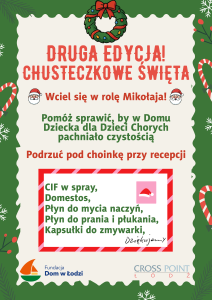 Zbliżający się świąteczny czas to doskonały moment, by podzielić się dobrem i wesprzeć tych, którzy szczególnie tego potrzebują. Dlatego z przyjemnością informujemy, że w Cross Point rozpoczęły się dwie akcje charytatywne, do których serdecznie wszystkich zapraszamy. Pierwszą z nich są „Chusteczkowe Święta 2”, czyli zbiórka środków czystości dla Fundacji Dom w Łodzi, prowadzącej Dom Dziecka dla Dzieci Chorych. To już 2. edycja tej szczególnej akcji w naszych biurowcach. Zeszłoroczna zbiórka przerosła nasze największe oczekiwania i zaopatrzyła w chusteczki Dom Dziecka dla Dzieci Chorych na cały rok. W tym roku zbieramy produkty takie jak płyny do prania, płukania, mycia naczyń, kapsułki do zmywarki czy CIF w sprayu. Można pozostawiać je w pudełkach ustawionych pod choinkami w każdym budynku. Dzięki Państwa wsparciu w Domu będzie mogło pachnieć czystością i ciepłem, które w tym okresie jest tak ważne. Drugą inicjatywą jest zbiórka na rzecz Wielkiej Orkiestry Świątecznej Pomocy. Przy recepcjach w budynkach A oraz B pojawiły się oficjalne puszki WOŚP, do których można wrzucać datki. Nawet drobne gesty przyczyniają się do wielkich rzeczy – razem możemy wesprzeć tegoroczny cel Orkiestry i pokazać, jak wielką siłę ma wspólne działanie. Z góry dziękujemy za każdą formę zaangażowania. Wierzymy, że dzięki wspólnej aktywności uda nam się realnie pomóc i sprawić, by tegoroczne Święta były piękniejsze dla tych, którzy najbardziej tego potrzebują.